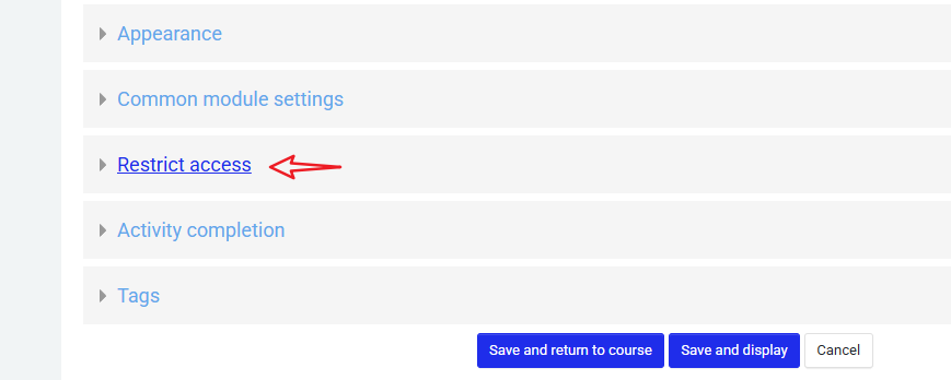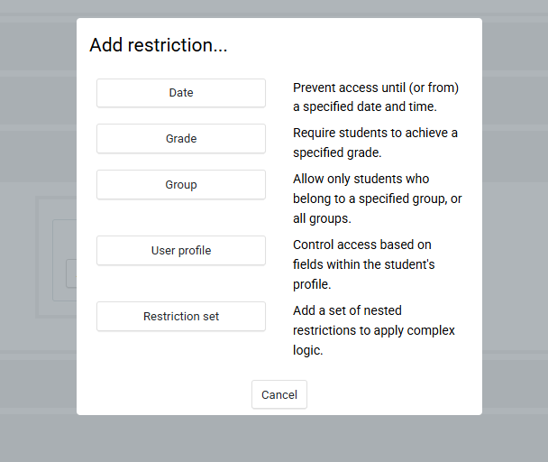 - Further restrictions may be added by clicking the 'Add restriction' button again, and it is possible to specify that ALL the conditions or ANY of the conditions are required before the activity is made available. Thus, it is possible to use 'Or' as well as 'And' conditions. See Using Conditional activities for an example