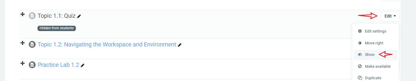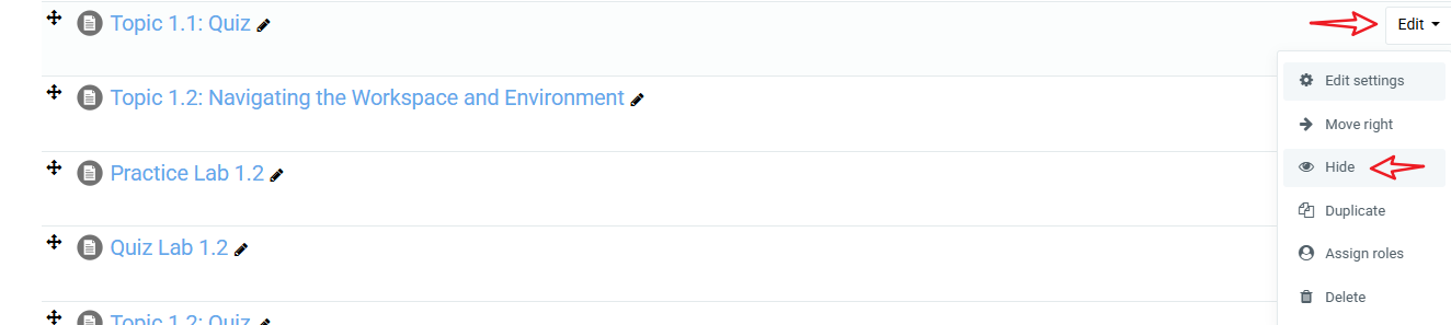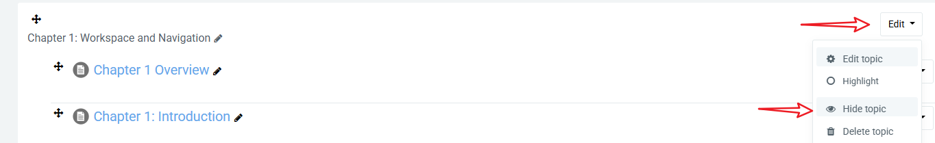 To hide an entire Chapter, the same applies. Select the Edit dropdown arrow beside the Chapter heading and select "Hide Topic". The students will not be able to see the chapter at all. To Unhide the Chapter, follow the same steps as before and select "Show Topic"